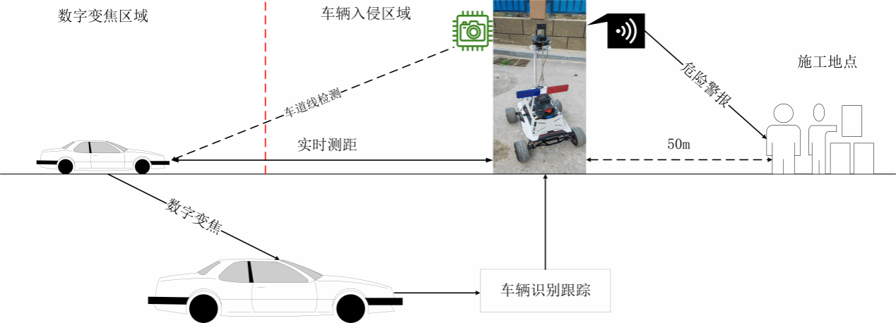 硕士研究生钱丰同学作为团队负责人完成的“基于计算机视觉的高速公路养护人员危险预警系统”获得一等奖。该系统通过计算机视觉的方式,为道路养护人员架起一道安全屏障。采用移动机器人平台,在其上部署深度学习视觉模型,通过车道检测、车速测量等技术,对养护人员后方来车方向进行监控,当有车辆靠近危险区域触发预警条件时,系统通过声光电和手环设施进行报警,比传统预警装置提升预警距离50米以上,能够大幅提升道路养护人员的安全性。本项目成果已进入应用孵化阶段。