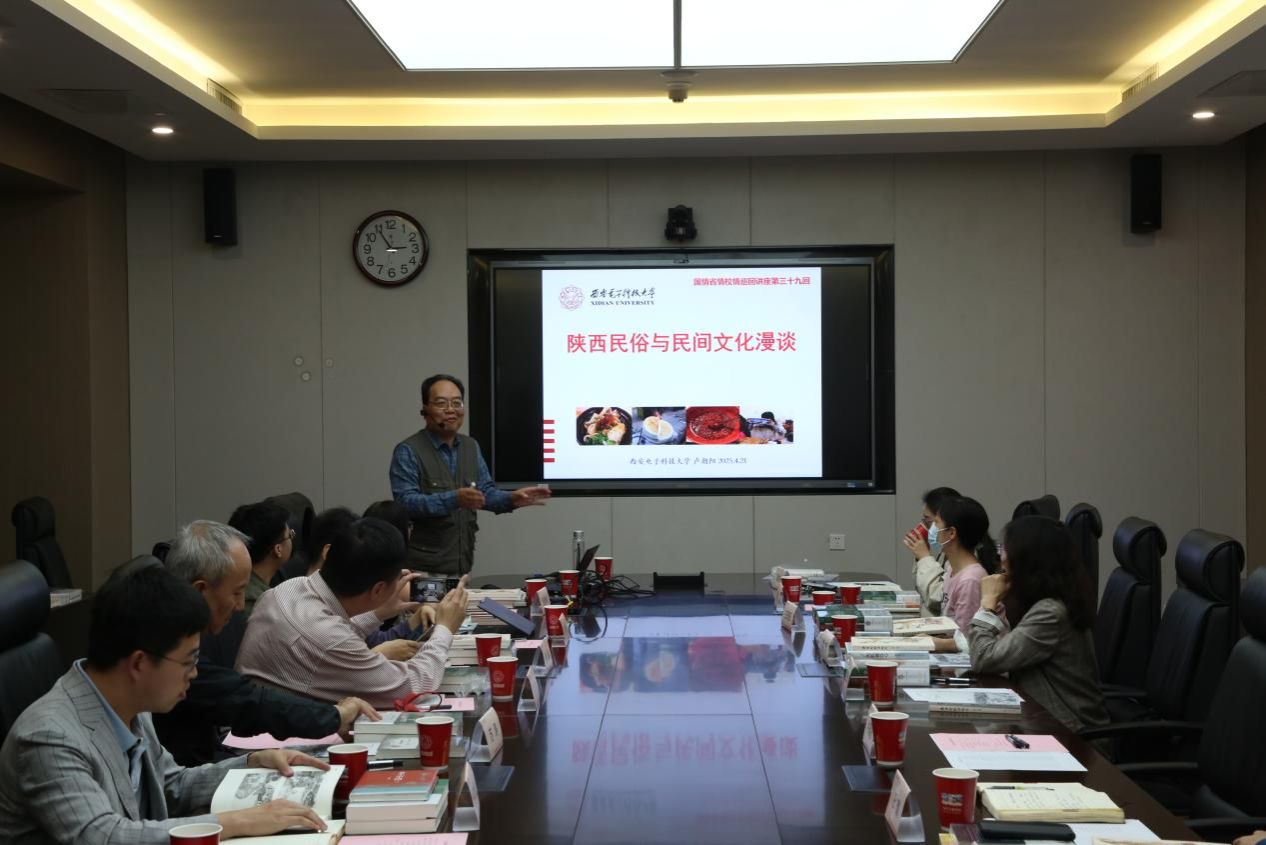 教授卢朝阳作“陕西民俗与民间文化”主题分享,卢教授以其深厚的文化底蕴和生动的讲述方式,带领师生们由“从古至今的陕西”“人间百态的陕西”“民歌戏曲的陕西”三个篇章开启文化之旅。报告分享了陕西的地形地貌、青铜器的辉煌、文字的演变、衣食住行的发展等,用视频、歌曲等与师生交流互动的方式,为大家展现了陕北民歌、陕北说书、秦腔、皮影戏的艺术特色和价值。分享结束后,卢教授精心准备了《陕西民俗学概论》《远远乡》两本著作赠予现场师生。